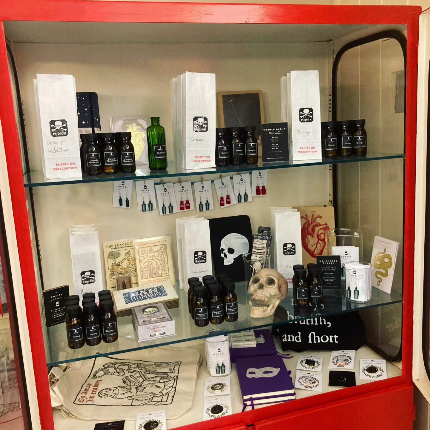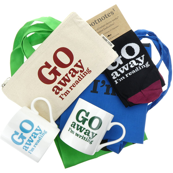 It contains Go Away mugs, tote bags and socks, typewriter and Badge of Honour pins, gift wrap, tea towels, notebooks and more.